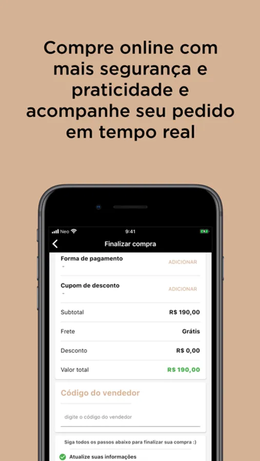 Faça suas compras de forma totalmente segura e acompanhe seu pedido no app.
