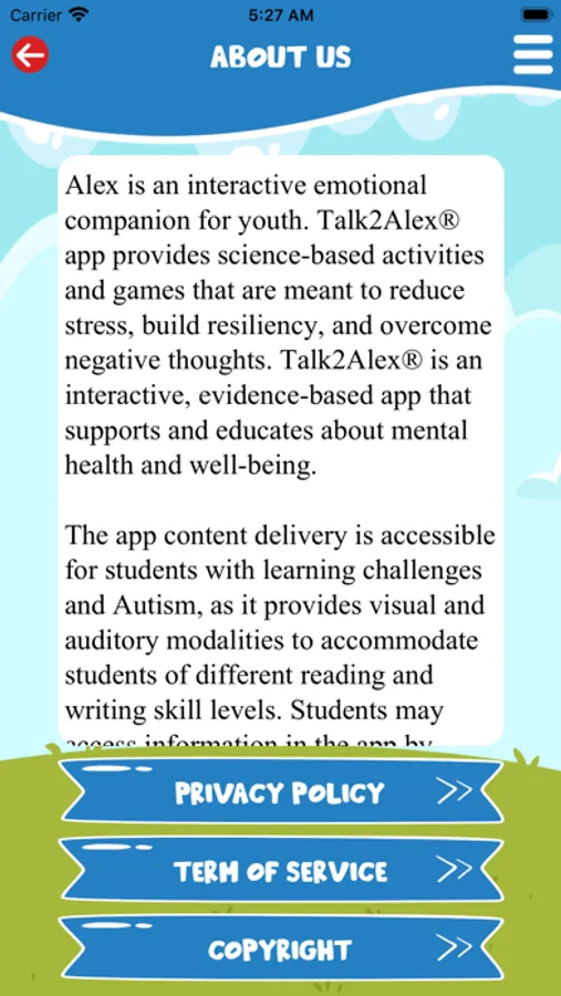 The app content delivery is accessible for children with learning challenges and Autism as it provided through visual and auditory modalities to accommodate students of different reading and writing skill levels. Students may access information in the app by either reading the content or listening (reading/listening) and input (typing/speaking) information.