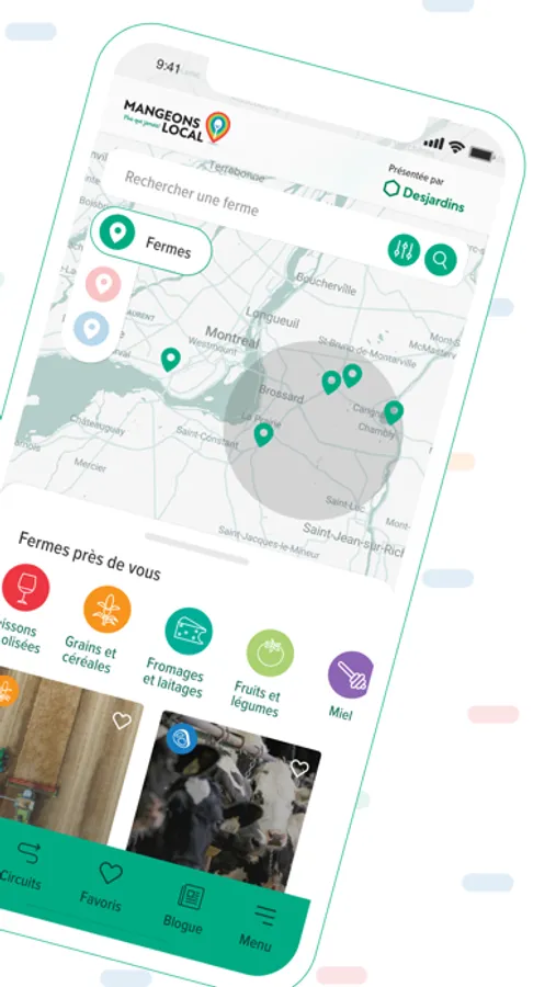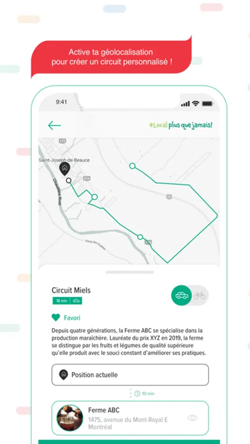 Activez la géolocalisation pour repérer les fermes, les marchés publics et les transformateurs qui sont près de vous. Consultez les fiches pour connaître les coordonnées, les produits vendus, les activités proposées, les heures d’ouverture et la petite histoire des entreprises que vous prévoyez visiter. Désignez vos endroits favoris, créez des circuits personnalisés et planifiez de belles virées gourmandes en auto ou à vélo!
