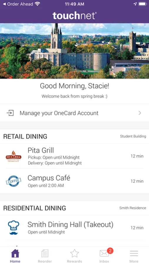 With TouchNet Order Ahead, you’re able to browse available campus restaurants and menus, place an order, pay with your OneCard or Credit Card, and earn loyalty points along the way.