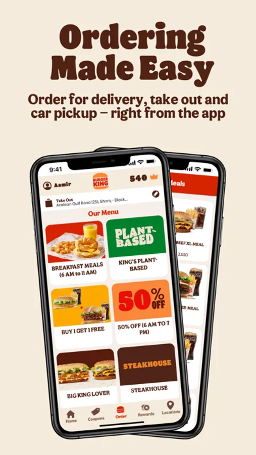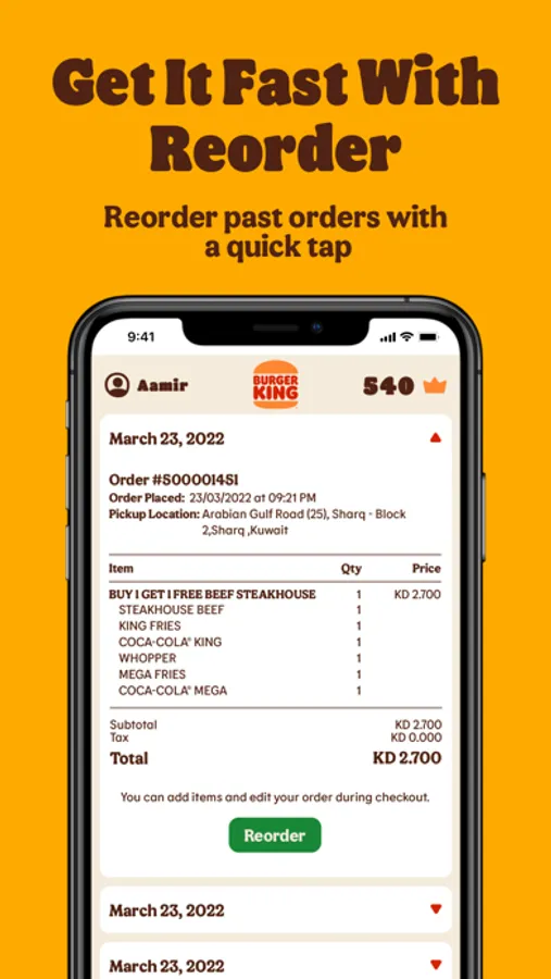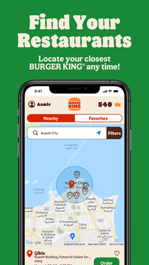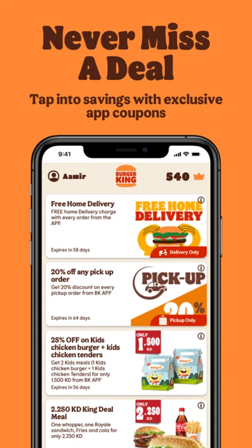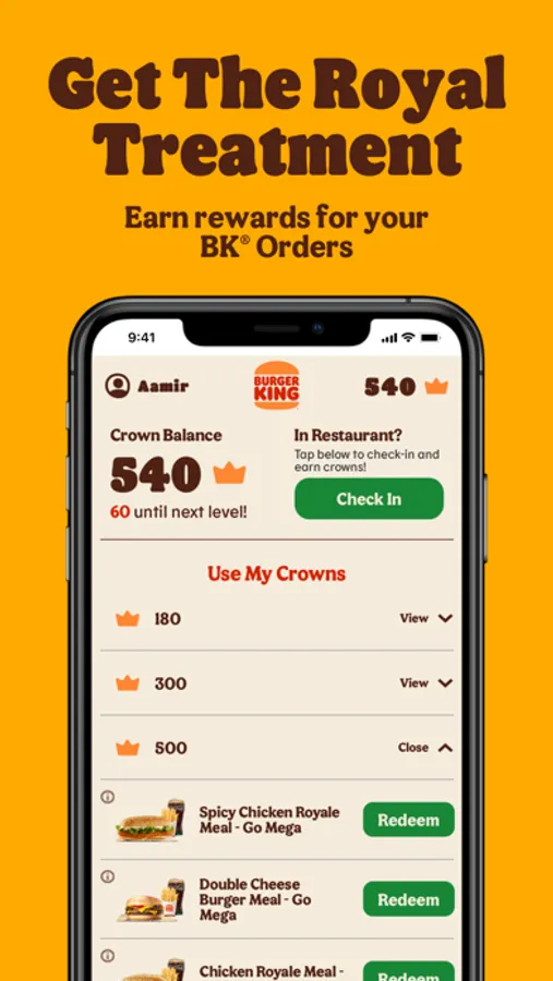 Get the royal treatment when you use the app! Be sure to sign in to earn Crowns with every order. Then redeem your Crowns for free food and drinks at participating BURGER KING® restaurants across Kuwait.