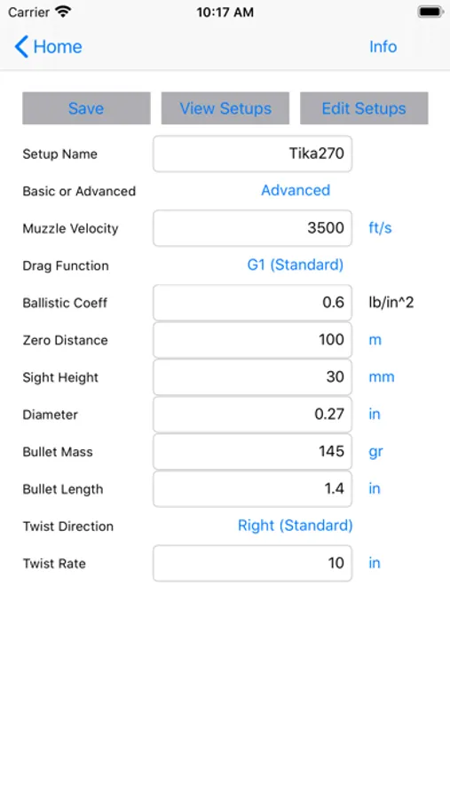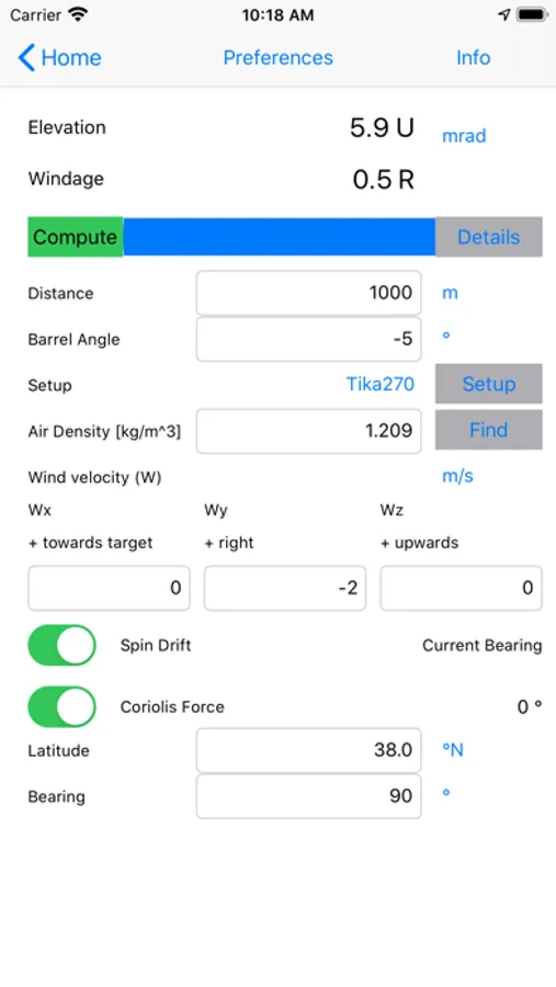 Ballistics Buddy calculates the ballistic trajectory and outputs the Elevation and Windage adjustments. The trajectory is influenced by gravity, the aerodynamic drag (G1 & G7), the wind, your specific rifle setup, air density (temperature, pressure/altitude, and humidity), Gyroscopic spindrift, and the Coriolis force. The aim of this application is to be quick and easy to use, while still being able to capture all of the significant factors which influence the trajectory.