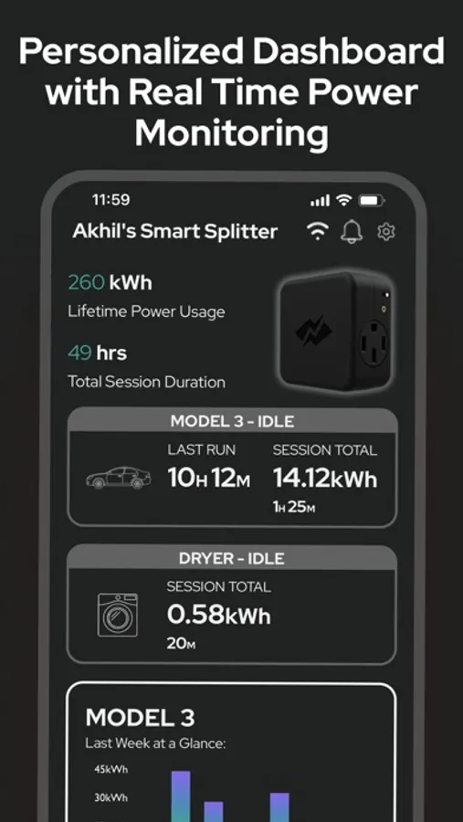 The Smart Splitter App allows the user to track real time and historical energy usage from both EVs and Appliances. Connect with your Smart Splitter to monitor your Smart Splitter status and recieve Over-the-Air firmware updates.