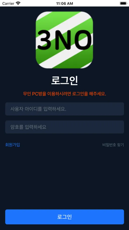 무인 PC방 이용시 앱을 통해 출입허가를 받고 입출입을 할 수 있는 PC방 무인 사용자 앱 3NO입니다.