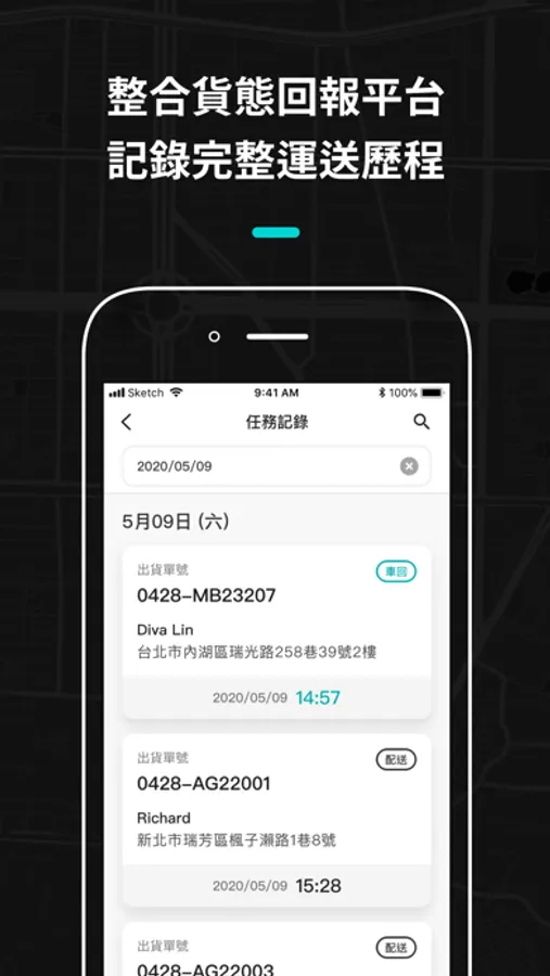Integrated cargo status to record the delivery history, data of each order can be tracked in this app. Drivers can easily obtain the information of each order with a click, while providing the address, recipient information and relevant delivery information of each order, also enabling drivers to directly contact the recipient to provide the best delivery service with navigation through this app.