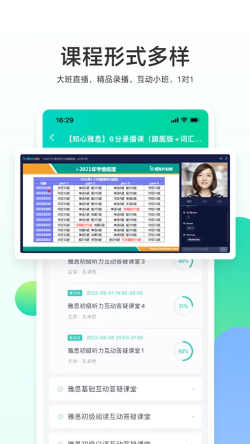 1.在线直播课:与老师、同学实时互动,解答讨论课程难题;上课视频可缓存,反复观看回放与笔记;