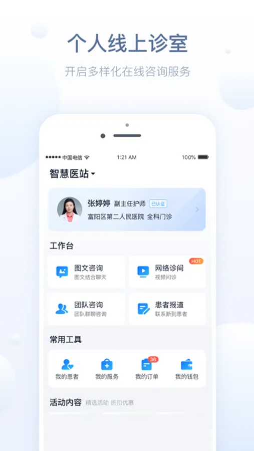 “智慧医站”:专为医生提供的患者管理和咨询、专病服务平台。医生可以在这里通过患者报到、随访等工 具来管理自己的患者,为自己的患者提供图文咨询、包月咨询、快速咨询、专病服务等各种诊后跟踪服务。