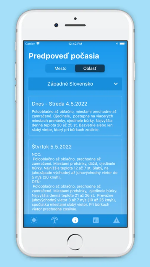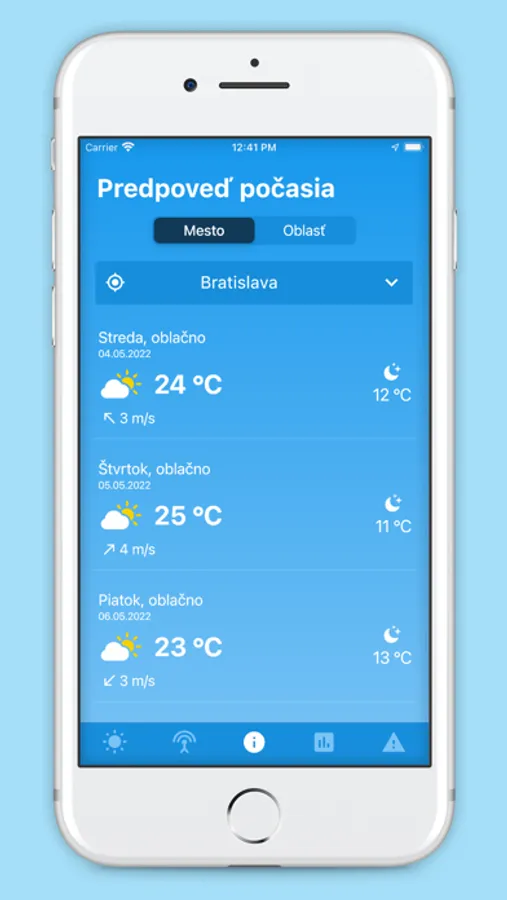 Aplikácia zobrazuje aktuálne informácie a predpoveď počasia.