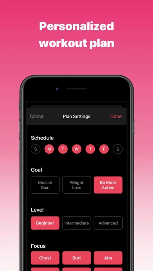 Within FitWomen, there are hundreds of training plans for you. It will ask you a few questions and based on your answer the APP will generate the training plans for you. You can choose from where you want to train, which body part you want to train, or even you want to train with bodyweight or free weight/machines. You can find plans for different levels, different body parts, different places, and training styles.