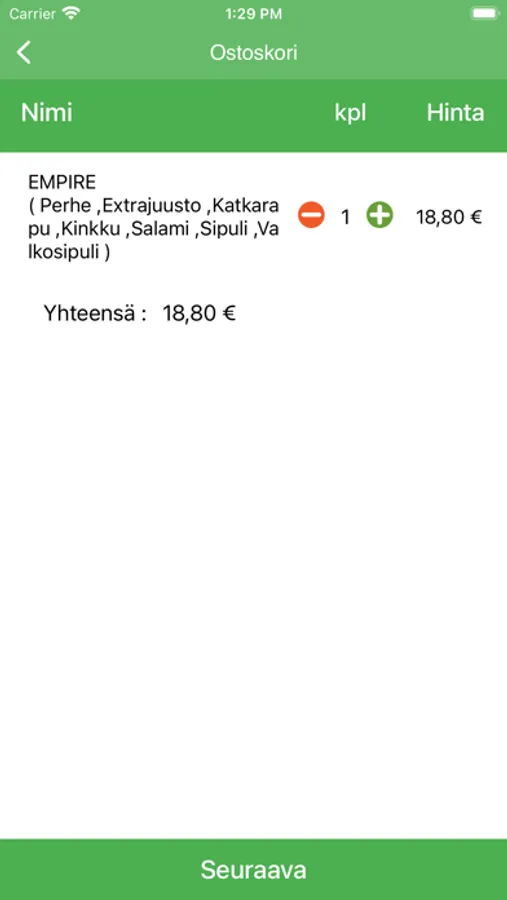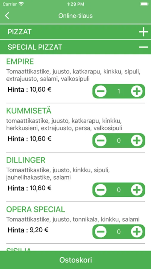 Tilaa pizzat ja kebabit noutona tai kotiinkuljetettuna. Tarjontaamme kuuluvat PIZZAT, KEBABIT, ETUSETELIT, SPECIAL PIZZAT, KANARUOAT, TEX-MEXIT, SALAATIT, HOT WINGS, LASTEN RUOAT, ALKOHOLIJUOMAT ja JUOMAT.