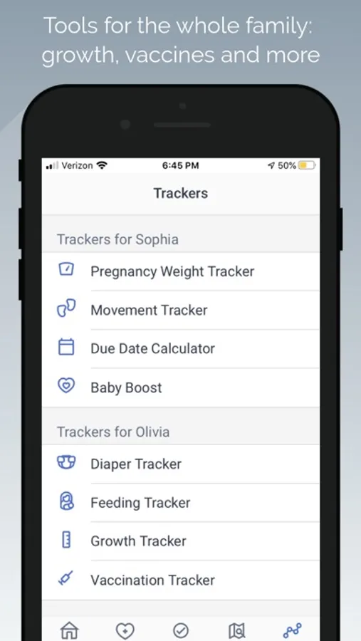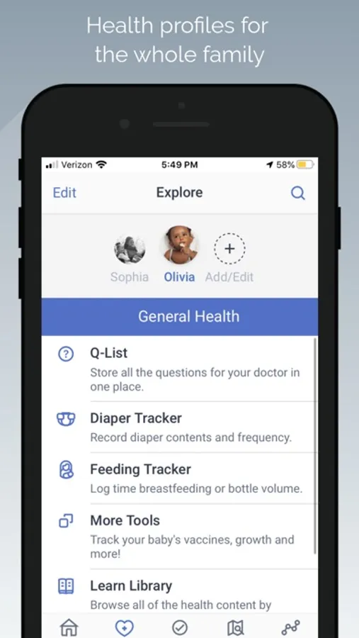 • Milestones | Create profiles for every family member, with health milestones for mom, dad & even grandma. The little ones have detailed milestones for those important first few years.