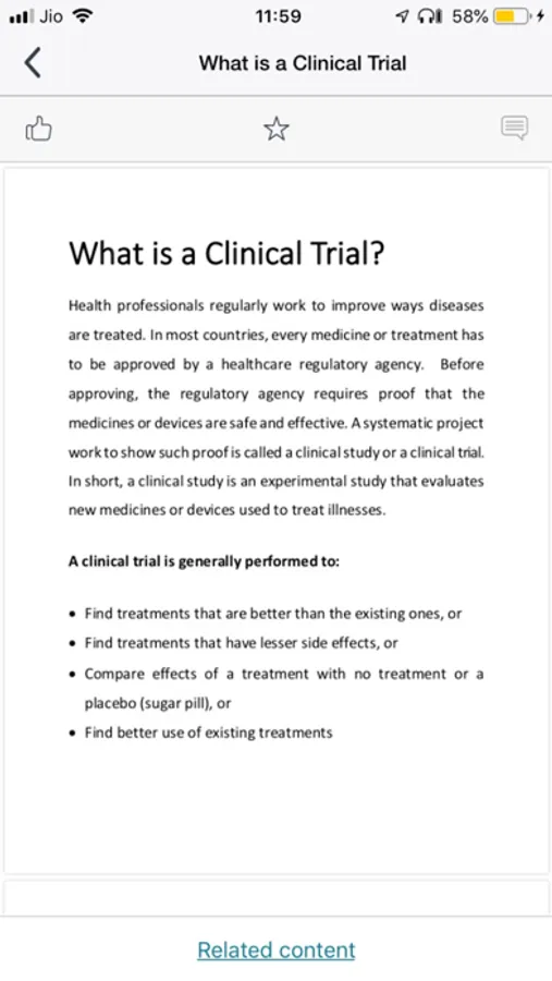 App for patients participating in a specific study only. myClinicalTrial enables patients participating in clinical study to access the information and provide feedback.