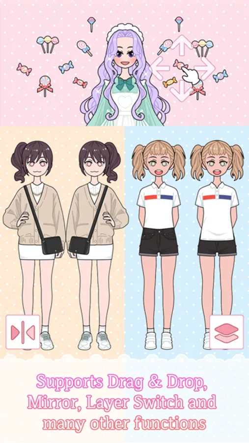 3. There are varied functions such as Mirror & Layer Switch, Drag & Drop, pretty animations, and plenty of storage. Please see Menu → Tutorial before you play.