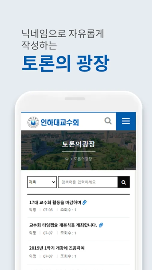인하대 교수회앱에는 회원 교수님들이 닉네임으로 자유롭게 의견을 개진할 수 있고 토론이 가능한 "토론의 광장"이 있습니다.