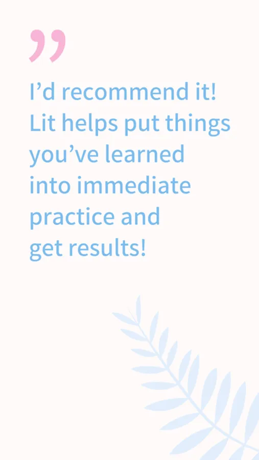 Meet Lit, your personal guide to help you MAKE A POSITIVE CHANGE IN YOUR LIFE. Unlike any other course or app on self-development, LIT inspires you to TAKE ACTION through assignments and practice. You put what you’ve learned into immediate action, so you reap the rewards from simply participating.