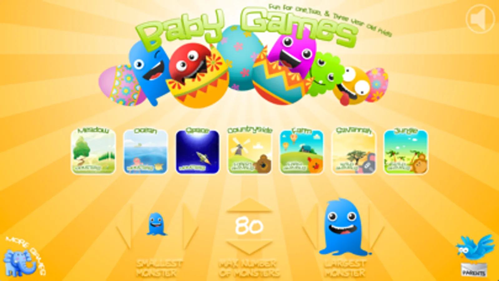 Parents are free to customize the games to suit the needs of their children. The size and the maximum amount of characters can be freely adjusted. While 1 year old might be best suited with only a few large characters to interact with, 2 and 3 year olds can handle much more!