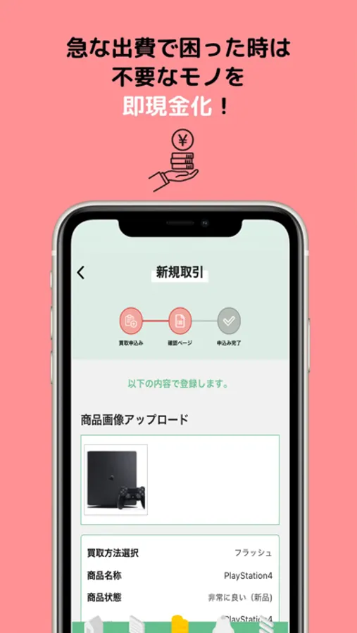 突然の急な出費で現金がない…そんな時はスマホで売りたいモノを写真に撮ってアップするだけで、その場で査定、最短10分であなたの手元に現金が。