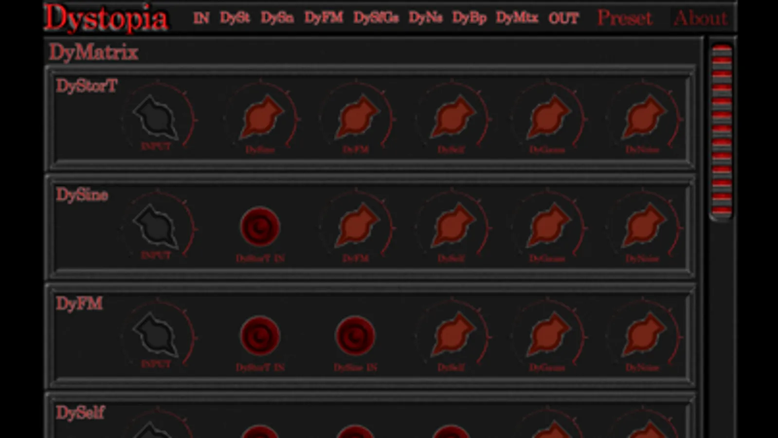 7 - DyStopia is an AudioUnit plugin that contains all the other plugins with the addition of a waterfall matrix in which we can divert the signals of the different distortions.
