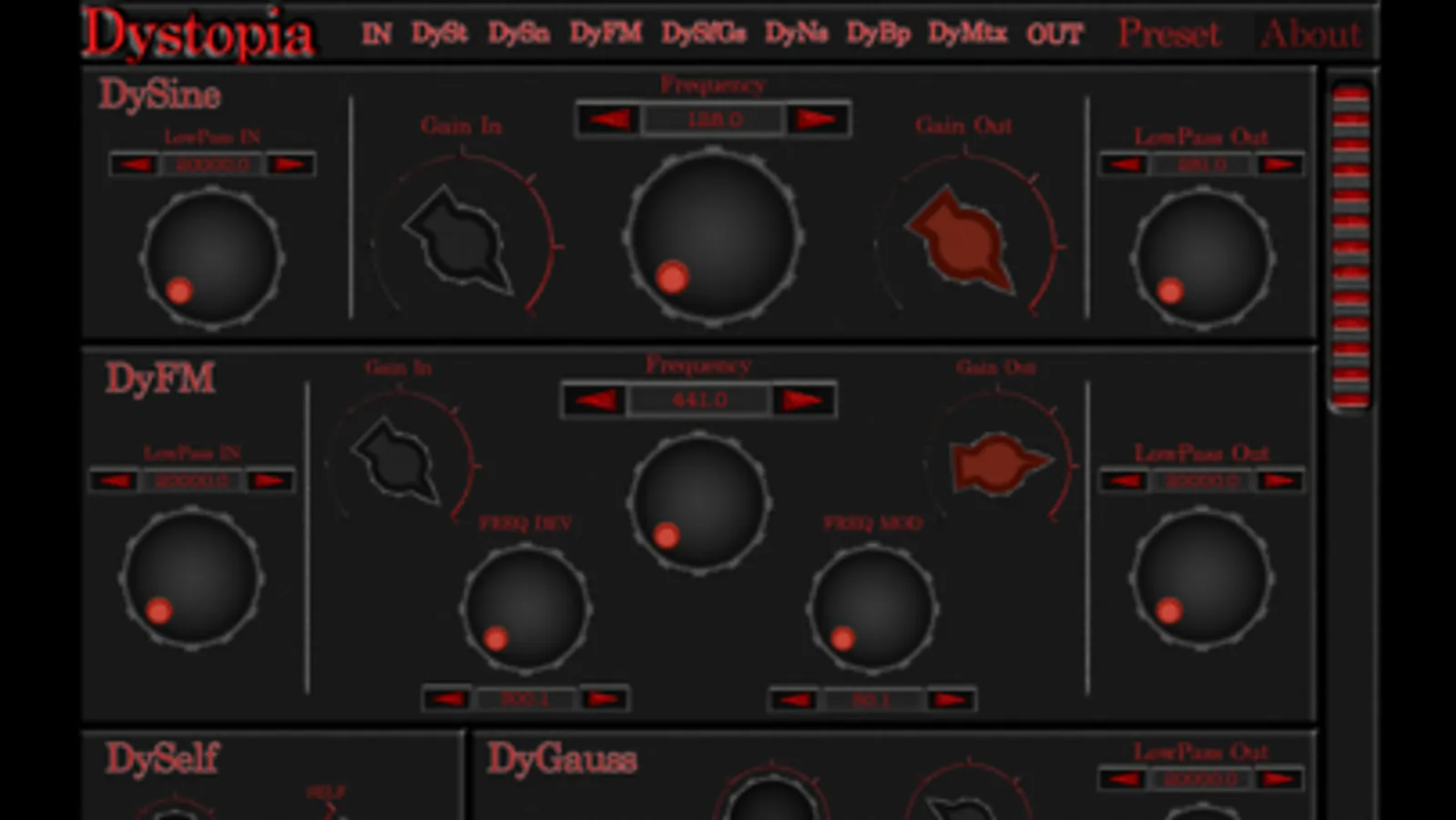 2 -DySine consists of a sine wave oscillator as driver, controlled by a LowPass filter of the input signal to be transfigured, Gain IN which acts as driver activator, Frequency controls the oscillator frequency, Gain OUT controls the level of distortion and a lowpass filter at the output resulting signal.