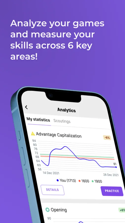 Get breakdowns on your performance in key areas such as Openings, Tactics, Endings, Advantage Capitalization, Resourcefulness and Time Management.