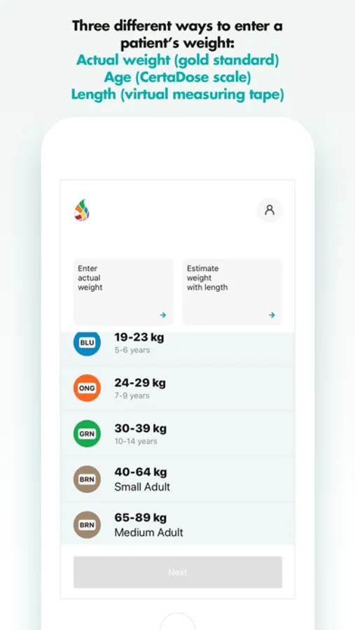 - Select from a dropdown reference of the common medication ranges appropriate for the patient's weight