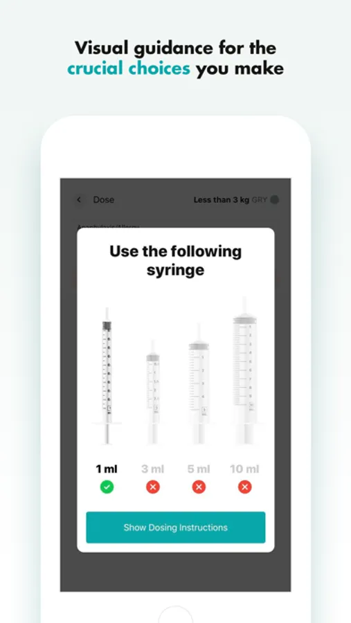 - Once the desired information is selected the app will provide an image of the most appropriate syringe for the desired volume selected