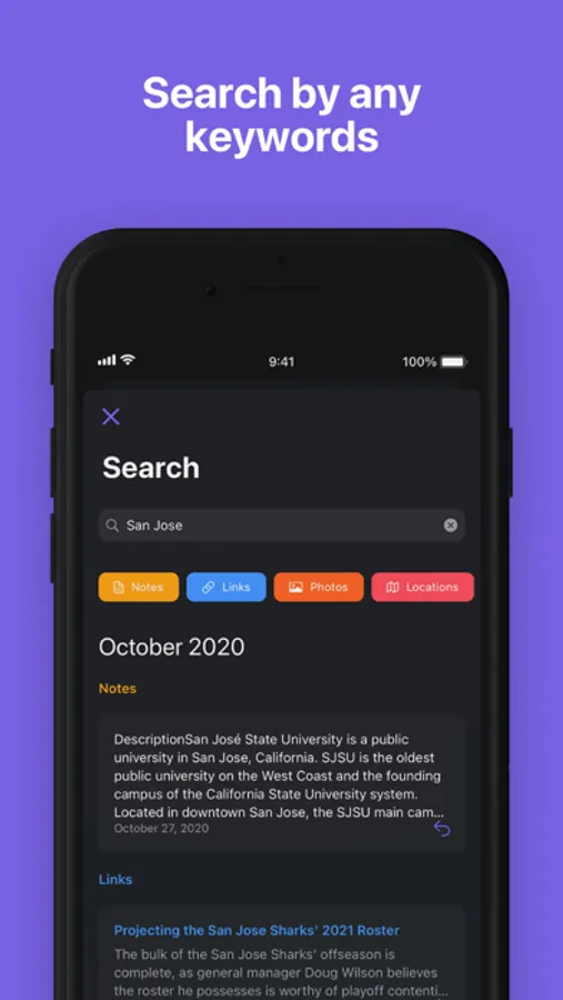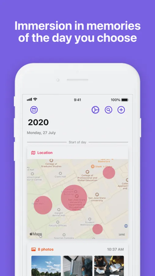 You can open a calendar anytime, select the day, or find an event/data using search. And then you can immerse yourself in memories: to live in memory the key events and feel the mood of that day.