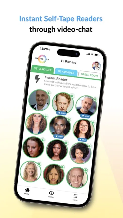 No waiting to request someone to come online. WeAudition provides INSTANT scene partners 24 hours a day, 7 days a week. Its UBER for self tape readers.