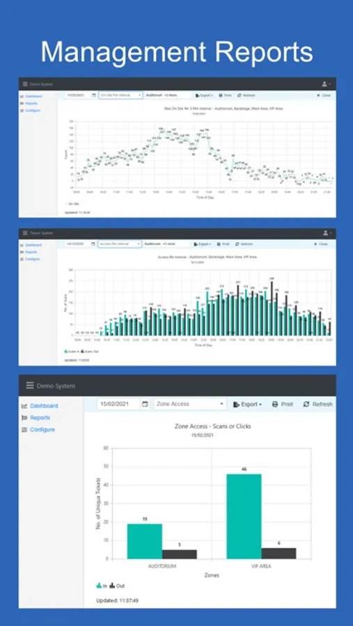 • Management Reports to help you make the best use of your resources: from making the most of available capacity, to the best deployment of staff. Giving useful information such as: how many people visit each day, which are the most popular days, when are the most popular times, which entrances get the most use, and which are the most popular areas on site.