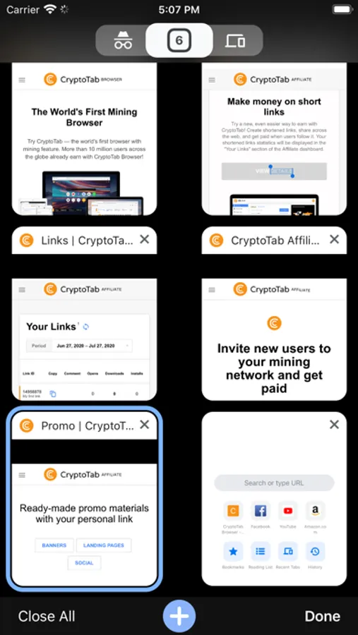 Add bookmarks, check history, keep a favorites list, open multiple tabs at once — CryptoTab Browser works just as you expect it to. But it also has a sweet cherry on top - with CryptoTab Browser Pro you get a fully functional control panel for CryptoTab services. Check balance, withdraw funds, monitor statistics — all the essential controls are at your fingertips.