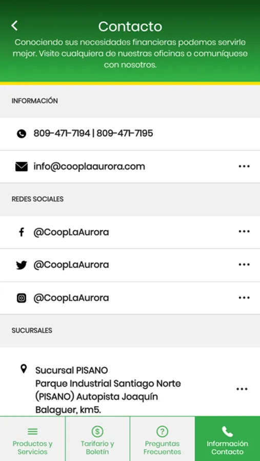 Para más información contáctenos en los teléfonos 809-471-7194 o 809-471-7195 o escríbanos a info@cooplaaurora.com