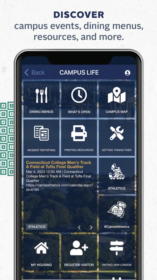 - Campus Life: Dining menus, what’s open, campus map, club information, athletics