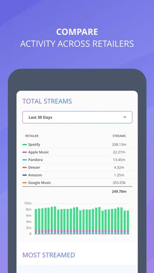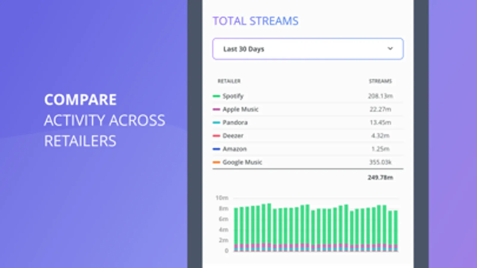See detailed streaming activity across the major retailers. Quickly identify the streaming service on which your song is performing best. Get a comprehensive view of total consumption in aggregate, by retailer, and by retailer stream sources.