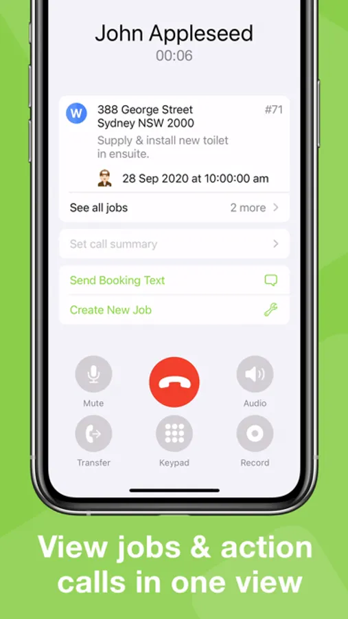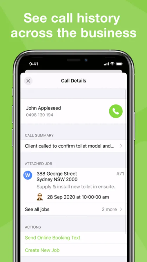A smarter phone system for trade contractors & services. Take & action client calls efficiently, professionally, anywhere. See which client is calling and their job history. Convert recent calls & voicemails to new jobs. Simplify call diversion after hours. Route business calls to multiple staff, simultaneously. Transfer between staff. Record & transcribe calls, and more.