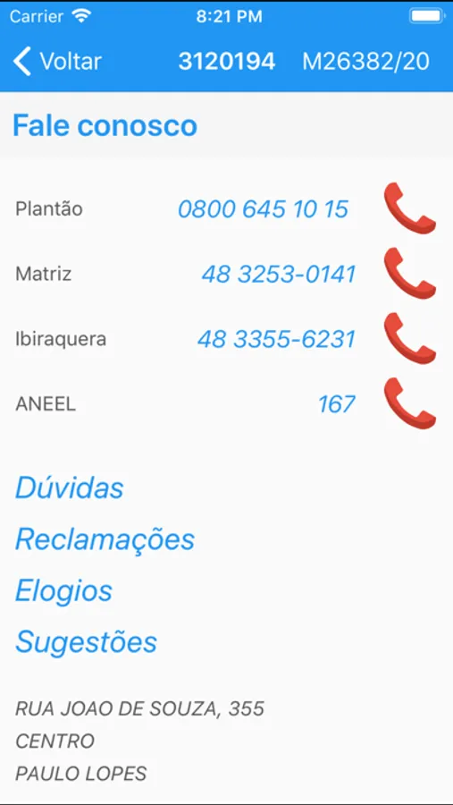 - Fale conosco: enviar reclamações, dúvidas, sugestões e elogios