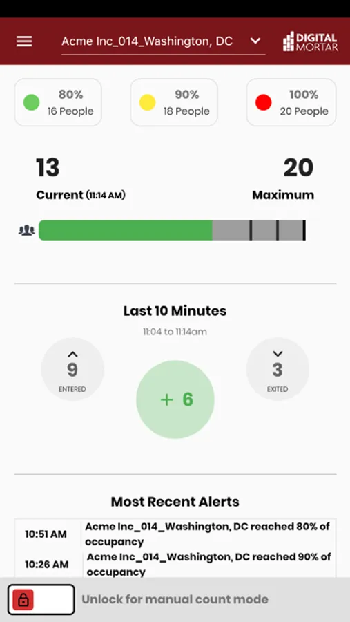 Automatically (requires people counting hardware) or manually track occupancy with precision. Set and adjust occupancy maximums and guidelines evolve. Configure location specific occupancy alerting thresholds and let individual users subscribe to the push notifications they need for their role. Create and manage user accounts and permission levels from an easy web interface. Surface occupancy information to your customers via on-site screens or web content --including seamlessly embedding real-time occupancy on your own web site.