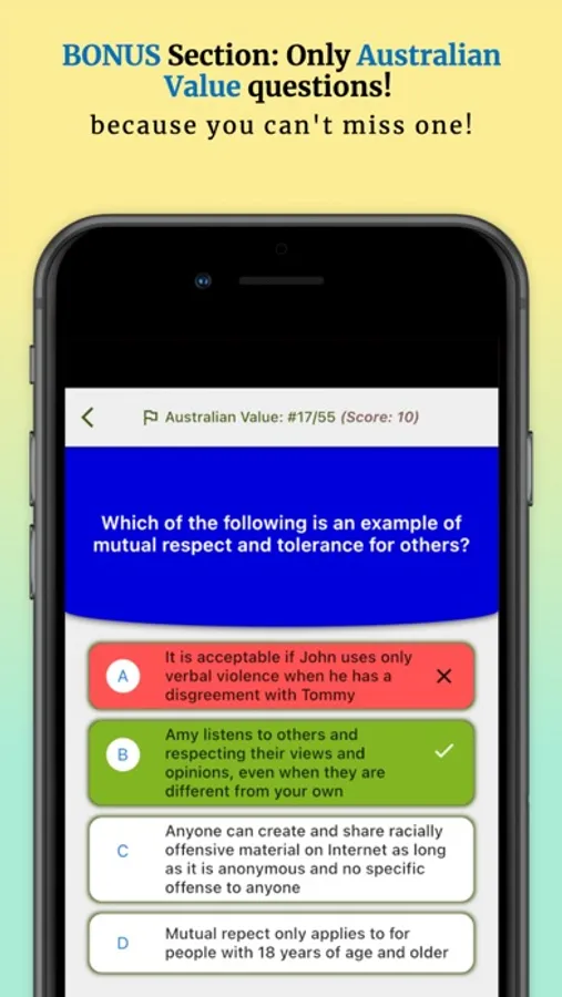 • BONUS section, Australian values questions Only! - 63 Questions (SIXTY-THREE!!)