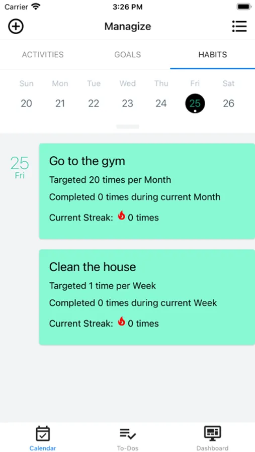 Manage your daily, weekly, and monthly habits. Set completion targets for each of your habits. Track streaks on your habits. Add notes to your habits.