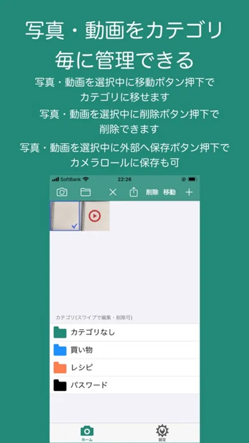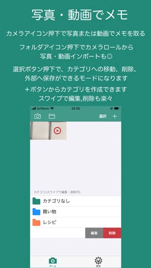 保存した写真・動画はカテゴリ毎に管理できて、後でテキスト入力によるメモを残す事もできます。