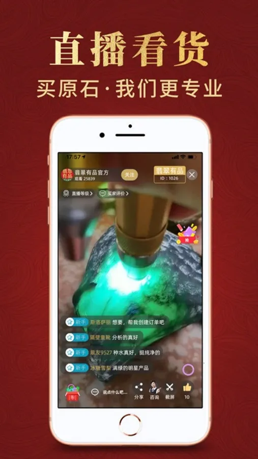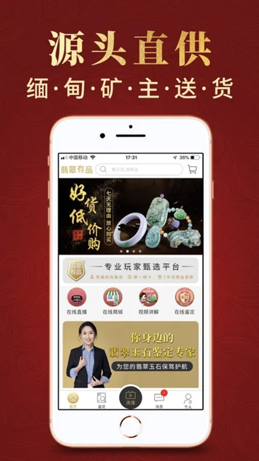 翡翠有品是一款翡翠玉石专业直播平台,线上线下一体销售,源头直供APP。矿主对接直播现场卖货,提供第三方担保交易服务,每一款货品都由专业主播层层把关,出国家级鉴定证书,支持全国复检!平台多名资深评估师,鉴定师,在线给你提供买货小技巧,买翡翠玉石,我们更专业!