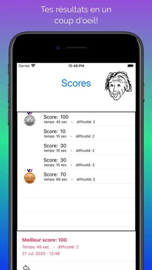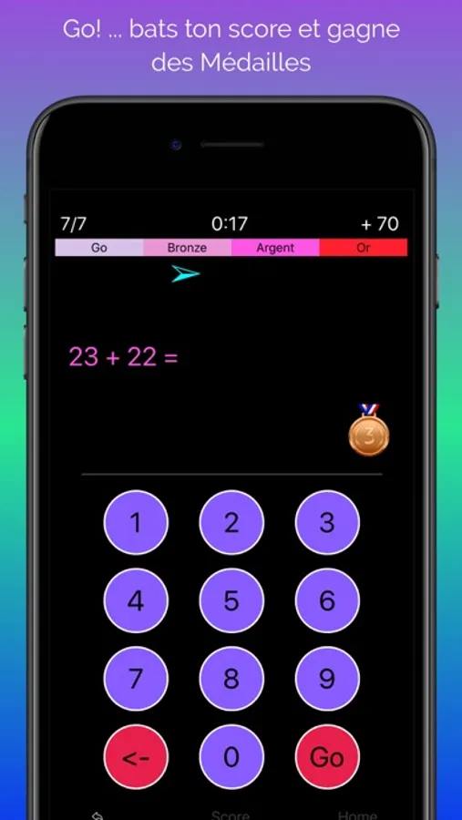 Fais le mieux que tu peux, bats ton propre score et gagne des médailles... bronze, argent, or ou remporte le prestigieux "badge Einstein"! Choisis les opérations: addition, soustraction, multiplication, division ou combine les toutes. La flèche bleue te guidera pour la course aux médailles.