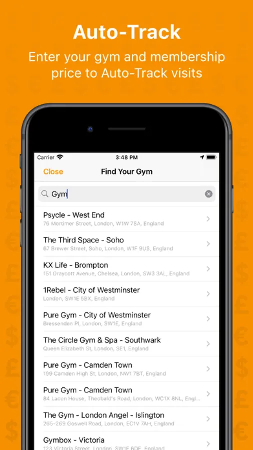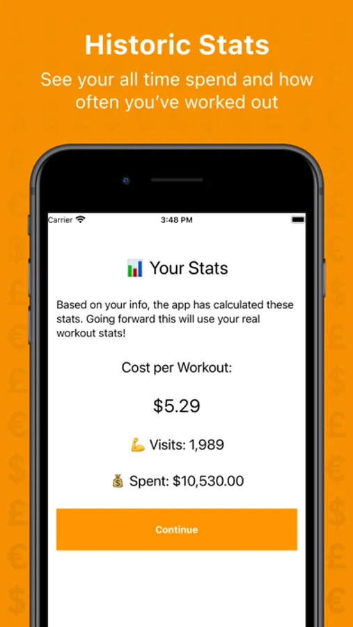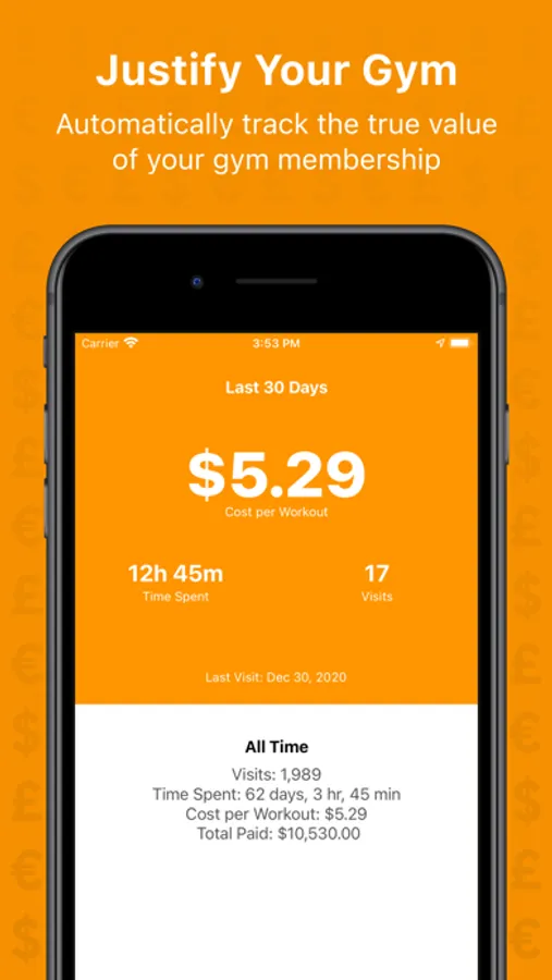 Automatically track your true Cost per Workout! Set your monthly gym membership price and the app will calculate the average price per visit.