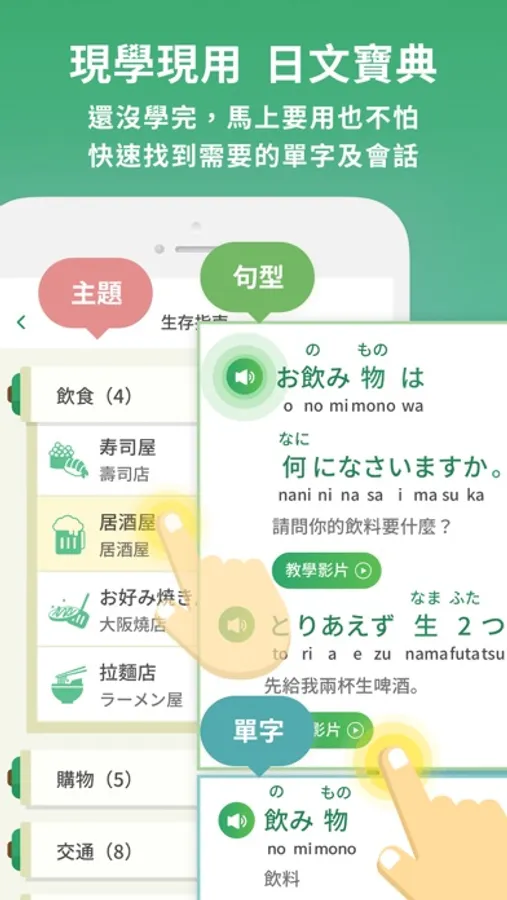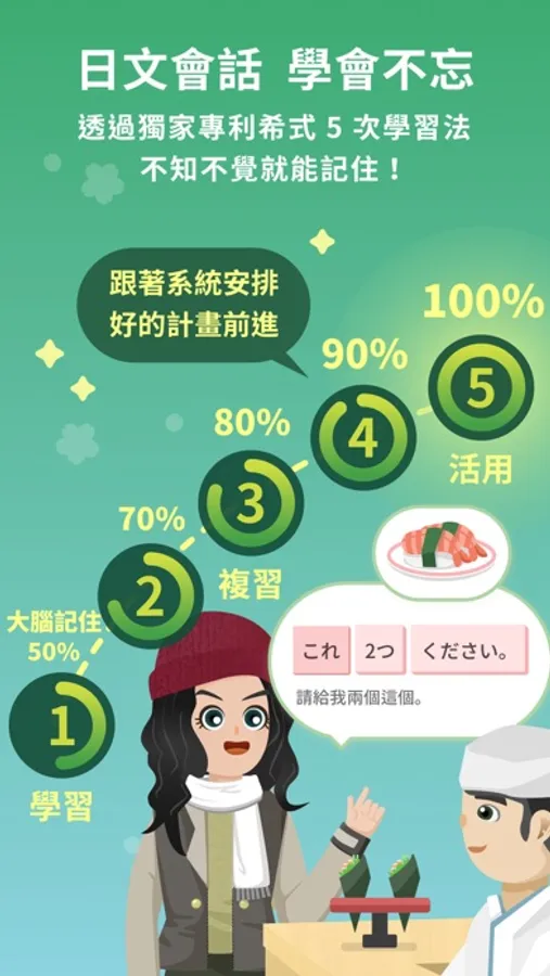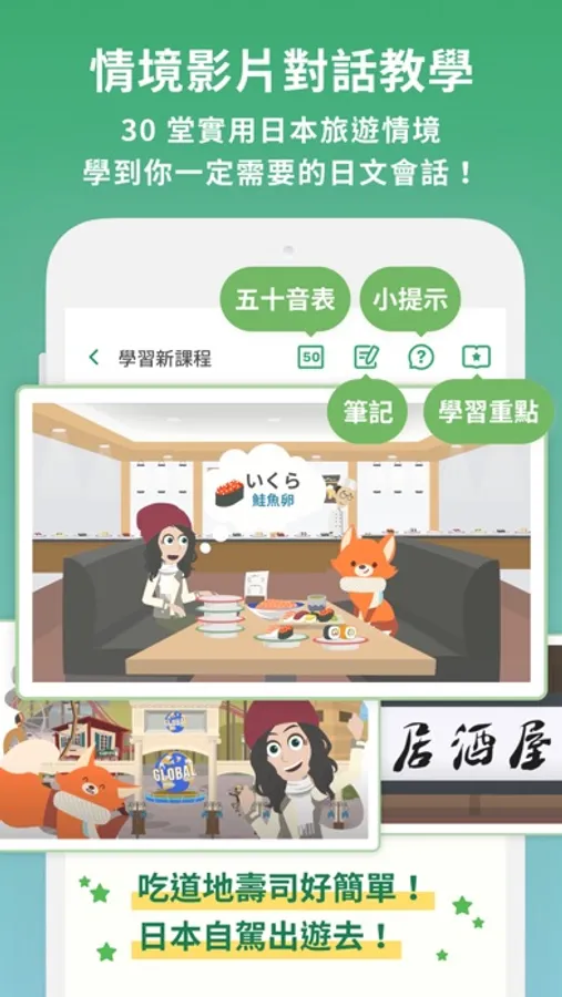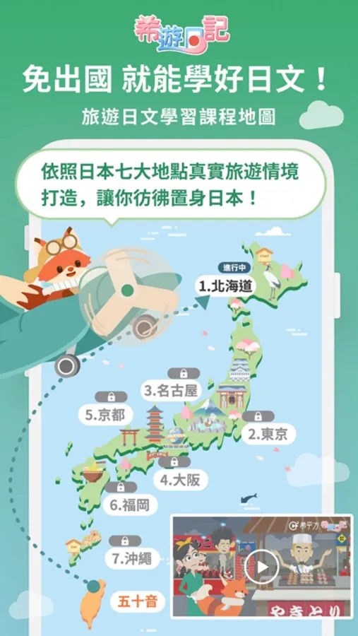 全新推出「旅遊日文會話課程 App」,獨家「計畫式學習法」搭配「日文學習課程地圖」打造彷彿置身日本沉浸式的學日文體驗,讓大家一起學標準日本語,五十音輕鬆學,完全不用死背,自然掌握日文語法結構,打造你的日文腦! JLPT 更不是問題!