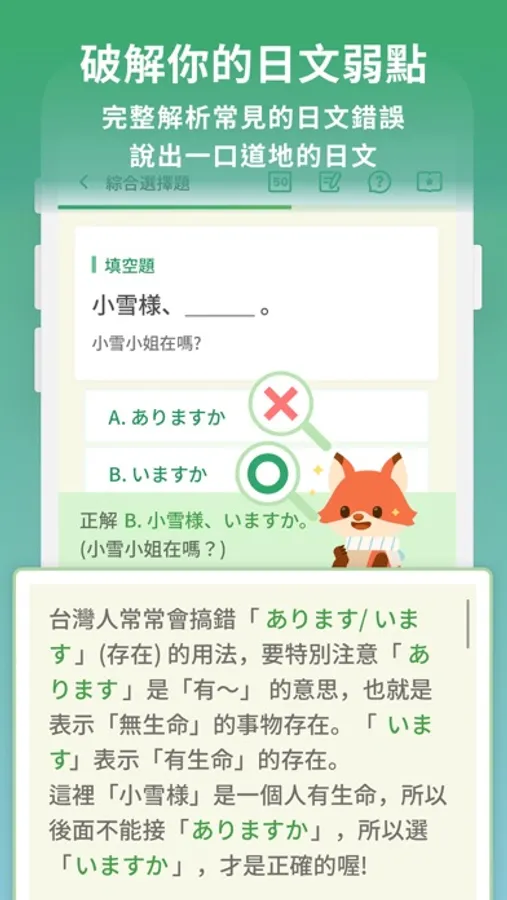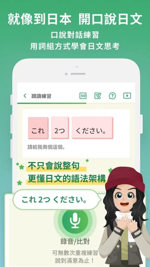 ► 多段語速:教學句子皆能進行整句及分段練習,以漸進式訓練出跟日本人一樣流利的日文。
