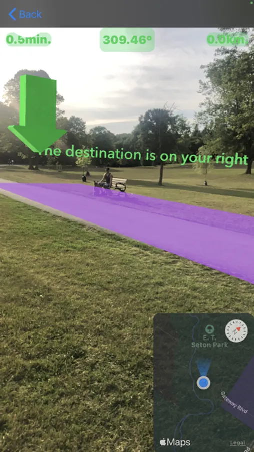 The app uses MapKit, CoreLocation and ARKit to place a path and arrows guiding the user to the desired destination.