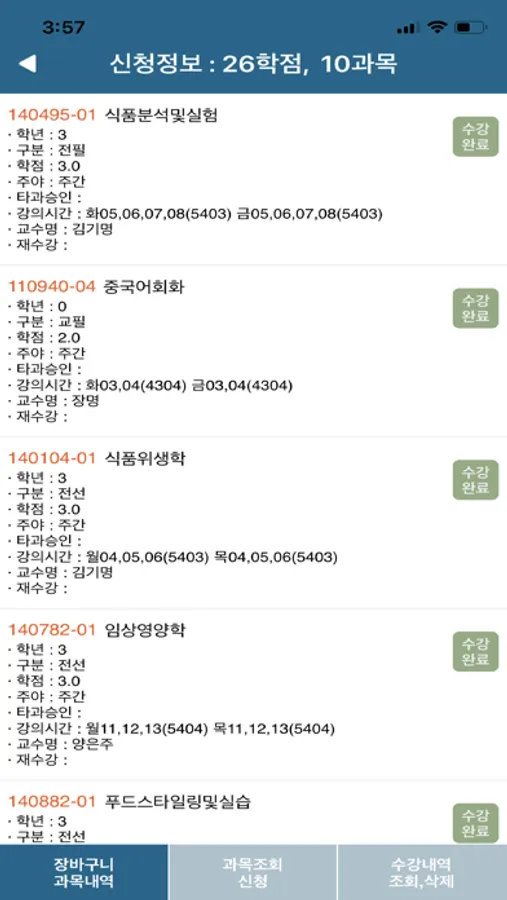 - 개설과목, 장바구니, 수강신청, 취득학점, 시간표 조회