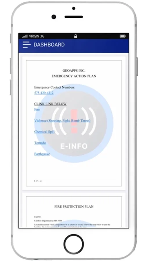 +Users download the E-Info App onto their smartphone device. Once they enter the geofenced location(s) they will automatically have the emergency plans, evacuation plans, and response plans designated for the location(s).