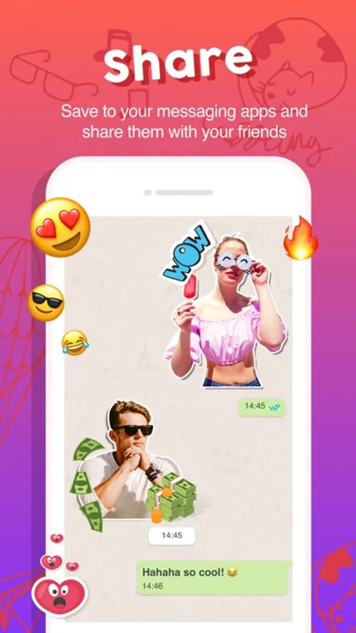 Share stickers in iMessage and Whatsapp apps: Share stickers with your friends in messaging apps.