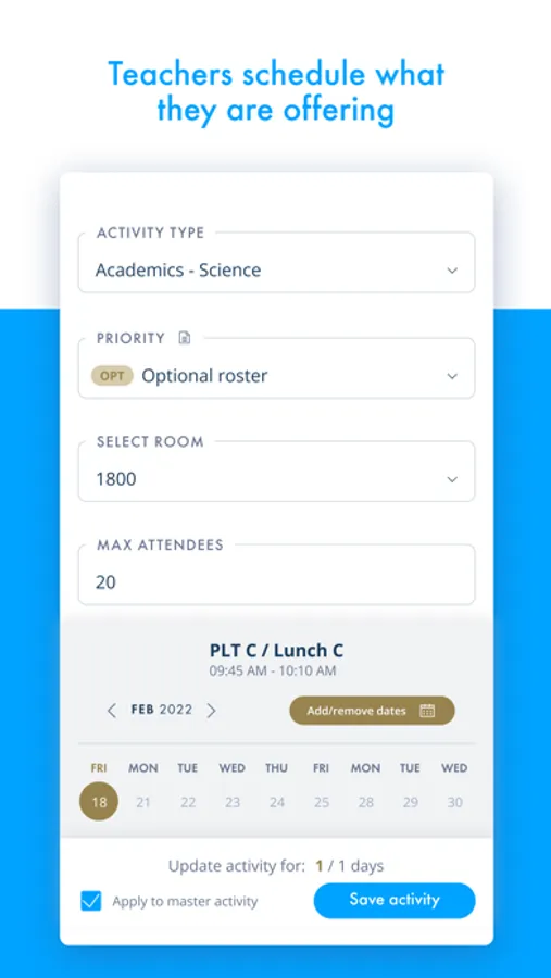 Get more hours out of your school day. Securly Flex (formerly known as FlexTime Manager) lets you get more out of the instructional time in each school day by making it easy to add flex periods to your school schedule. Flex periods can help students gain more instructional time during the school day and create opportunities for personalized learning. While many schools see the value in offering flex periods to their students, implementing them can be a logistical nightmare. Securly Flex is a scheduling tool designed specifically to solve these problems. With Securly Flex, every aspect of flex period implementation—including agenda notifications, capacity management, rostering, and more—is made so much easier. Teachers can easily customize flex period offerings, and students gain voice and choice in their education. Provide more than a typical school experience. Teachers offer, students choose. With Securly Flex, you can: