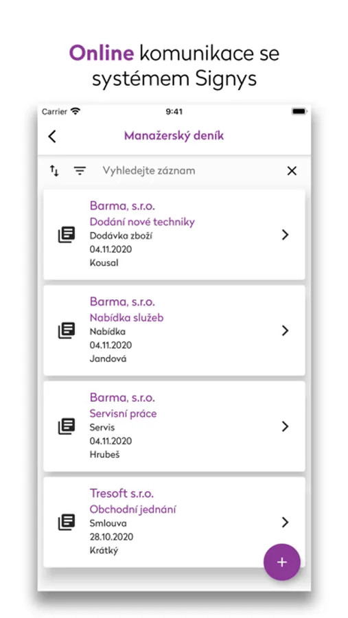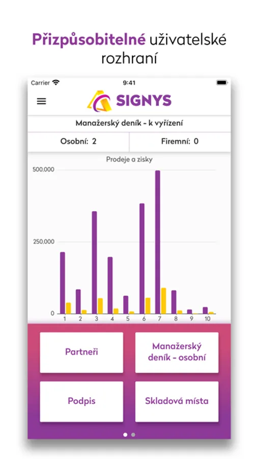 Poskytuje kompletní přehled o obchodních partnerech, informace o produktech, skladech, záznamy z jednání a schůzek, evidenci úkolů, náhledy na dokumenty partnerů a artiklů, elektronický podpis dokladů, propojení s analytickým nástrojem Signys BI a mnoho dalšího. Vše v reálném čase on-line. Aplikace je určená primárně pro management, obchodníky a obchodní zástupce společností.